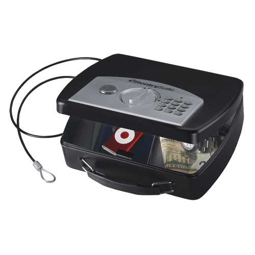The Portable Lock Box P008E is designed with you in mind. The P008E offers added security for your irreplaceable items with a digital lock, steel tethering cable, and override key. Complete with a carrying handle, this safe is ideal for protecting your most valuable compact possessions including cell phones, wallets, keys, iPods, and more.